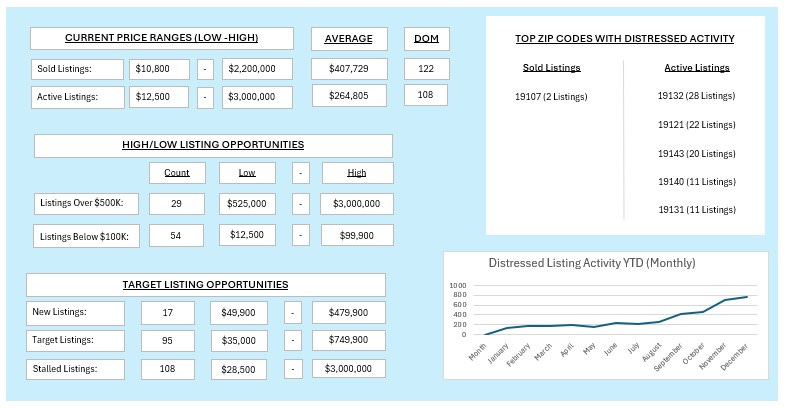 Relevant Market Signals: Geographic concentration is key. Zip codes like 19143, 19132, 19121, and 19140 are showing the highest volume of distressed inventory. However, the modest sales volume (14 sold vs. 236 pending) suggests that while deals are going under contract, the closing process is lengthy.