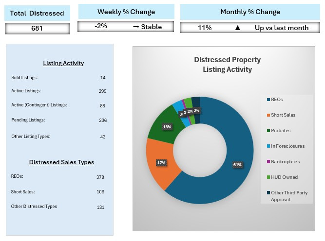 Bank-Owned Dominance (REOs): The market is heavily weighted toward Real Estate Owned (REO) properties, which account for 378 listings (approximately 56% of distressed inventory). This suggests that lenders are actively clearing foreclosure backlogs. Conversely, Short Sales remain lower at 106 listings, indicating that fewer homeowners are successfully negotiating pre-foreclosure exits compared to the volume of homes being repossessed.