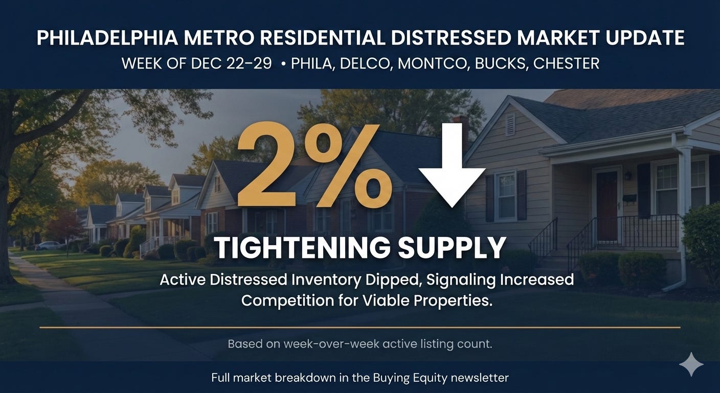 The Philadelphia metropolitan distressed market closed 2025 with a mixed signal: short-term stabilization masked by long-term accumulation. For the week ending December 28, total distressed listings dropped slightly by 2% (from 693 to 681). This decline is consistent with typical seasonal behavior during a holiday week.